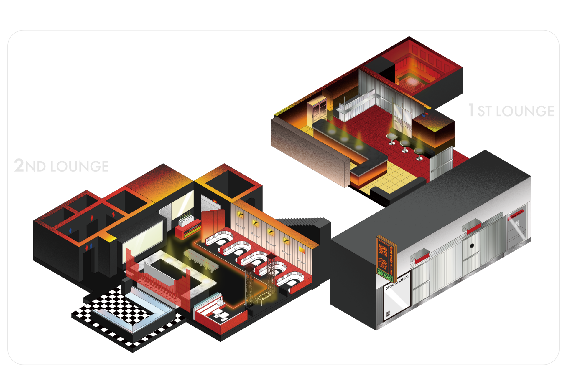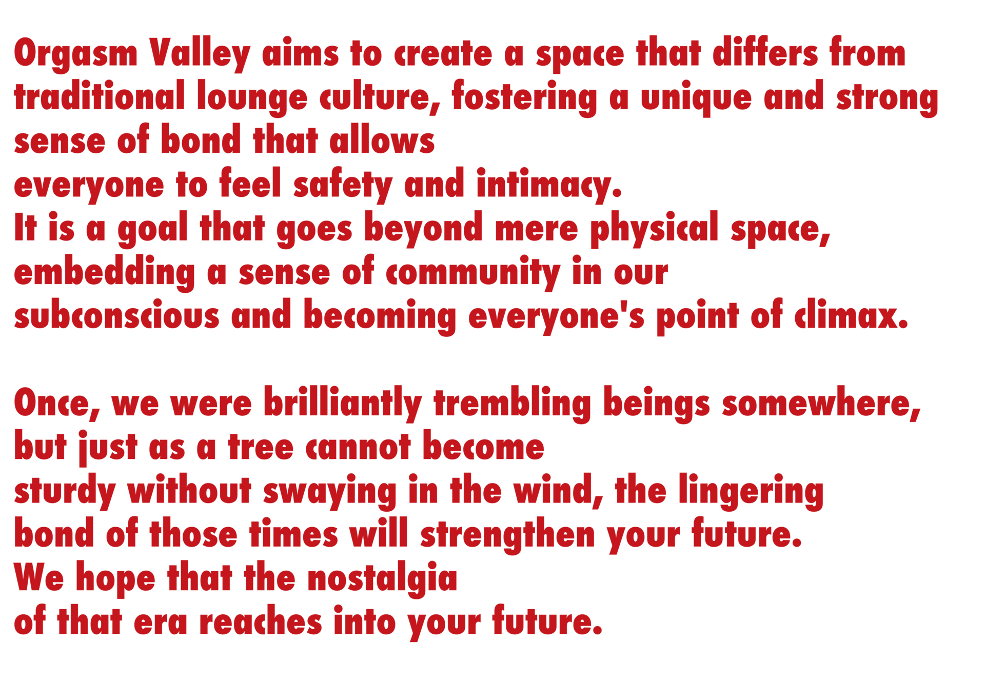 Orgasm Valley aims to create a space that differs from traditional lounge culture, fostering a unique and strong sense of bond that allows everyone to feel safety and intimacy. It is a goal that goes beyond mere physical space, embedding a sense of community in our subconscious and becoming everyone's point of climax.